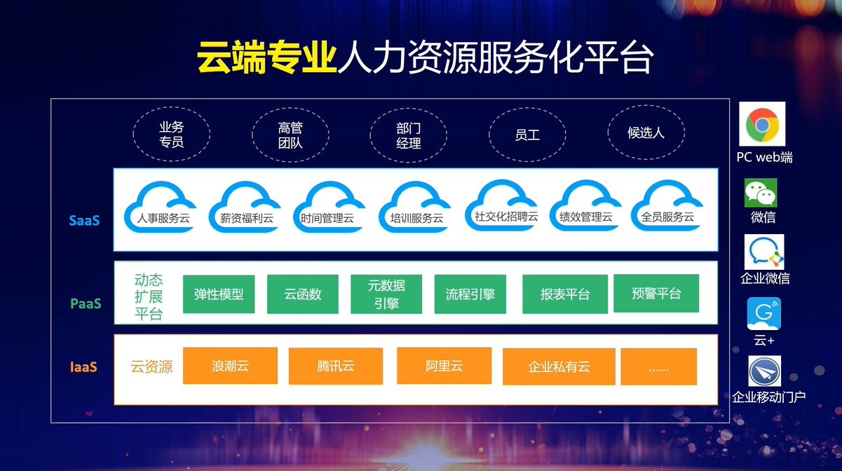 业务平台给予多级别的扩展模式;部署平台可实现从私有云到公有云无缝切换;扩展平台实现20万员工柔性扩展。