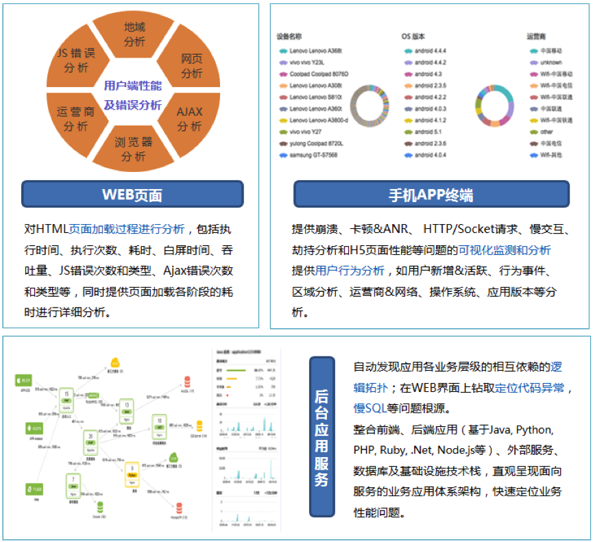 应用质量管控,Ebpay应用质量管控系统给予对应用全生命周期和全事务过程的质量托管。从用户终端、后台服务到IT设备层的端到端全程监控;应用性能劣化预警;应用性能分析与根原因定位;用户体验分析和问题过程回放;用户活性分析、转化率分析;