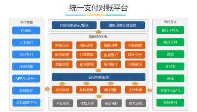 Ebpay统一支付对账平台,针对海南人民医院解决医院账务统一管理、对账、轧账的难题,实现线上线下各类支付方式全覆盖接入,支持自动对账、错账处理、线上退费、订单追踪、异常提醒、统计分析等功能,给予财务一站式结算、对账解决方案。